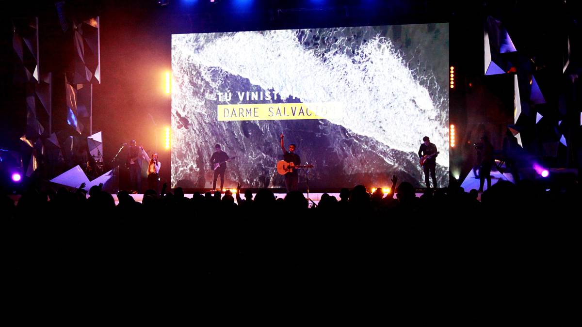 En un momento, se quita el audífono porque algo lo desconcentra y le pregunto qué sucede y me pregunta si quiero escuchar, y quiero. Hay dos canales. Por el primario se escuchan las canciones que interpretan cerca de cuarenta músicos que están ubicados a la derecha de la plataforma, encerrados por módulos acústicos —nunca paran de tocar— y la voz del pastor Rodríguez que ora con fervor, casi a punto de llanto; el segundo canal se escucha más fuerte: habla el hijo del pastor, da instrucciones claras a la orquesta: “Vamos tocando suave, suave, suave... Vienen palabras motivadoras, vamos subiendo la música in crescendo”.