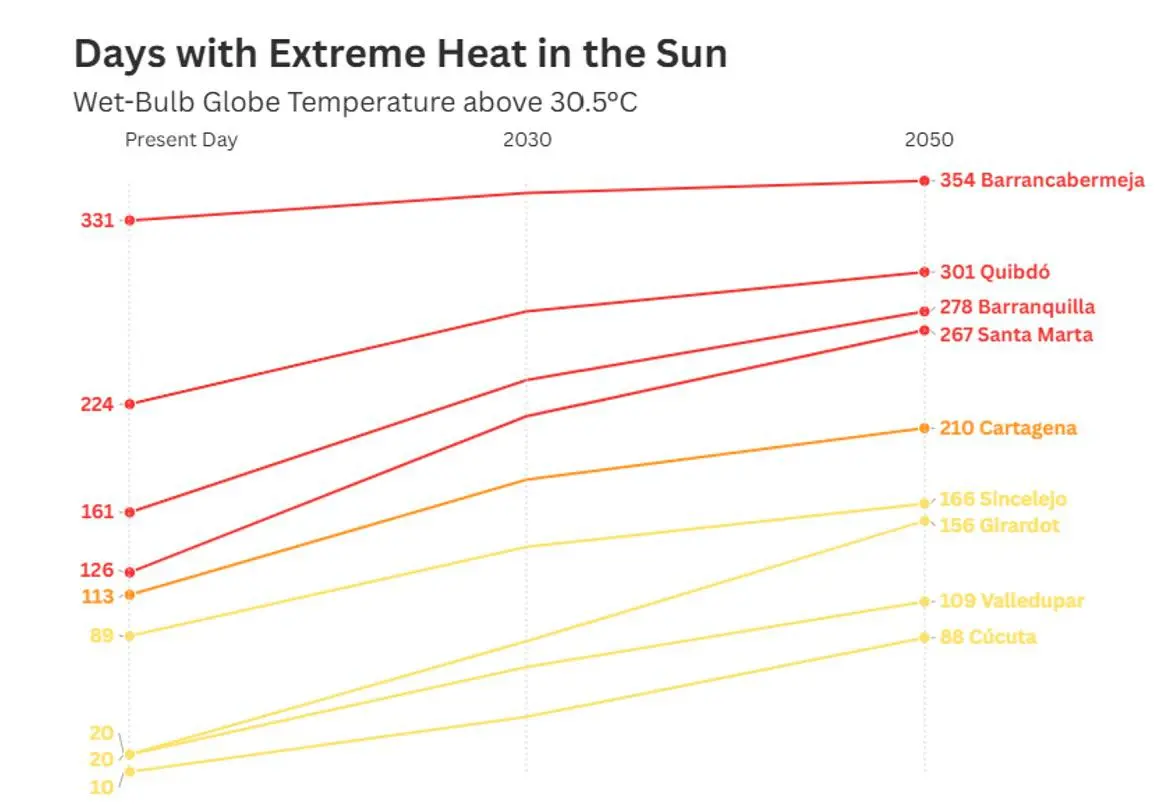 Con un aumento entre 1,59°C a mediados de siglo (2040-2059), las 50 ciudades tropicales de la región podrían convertir su cotidianidad en un verdadero infierno, como Barranquilla, que actualmente experimenta hasta un equivalente de seis meses con temperaturas por encima de los 30,5°C, y que para 2050 alcanzaría los 278 días de calor extremo (equivalente a 9 meses).