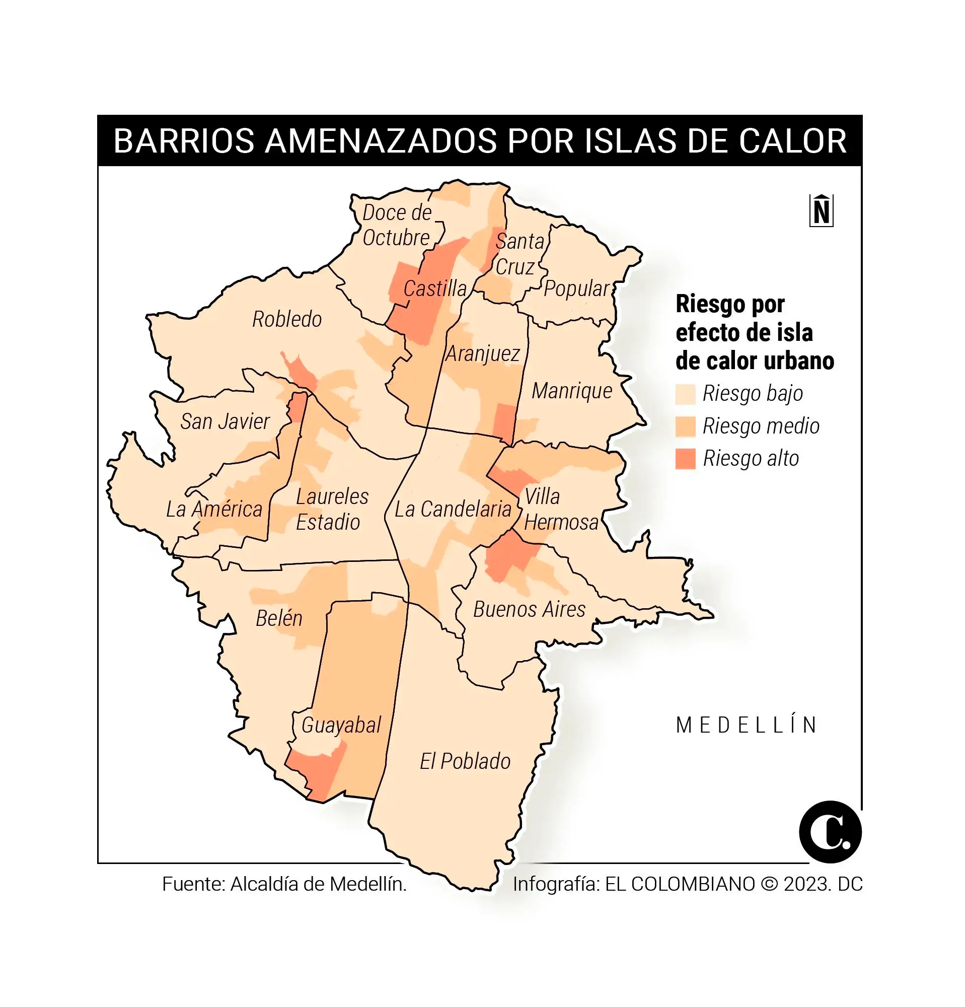 Medellín ofrece un ejemplo brutal de esto. En catorce barrios sus habitantes padecen alto riesgo por el efecto de isla de calor (ICU), un fenómeno térmico en el que ciertos determinantes, como la ubicación, el exceso de urbanización, la deficiente calidad de los materiales con que construyen las casas y los bajos niveles de cobertura vegetal causan que en unas zonas puntuales se generen unas especies de burbujas en las que la temperatura es mayor al promedio en una misma ciudad. Así las cosas, si en la ciudad se reportan 30 °C, en esos barrios sus habitantes pueden sentir una temperatura de hasta 34°C.