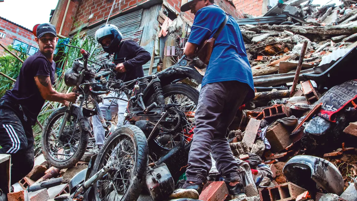 Así quedaron las viviendas luego del colapso estructural en el barrio La Cruz. Los dueños de las motos afectadas intentaron recuperarlas entre los escombros. FOTO JULIO CÉSAR HERRERA