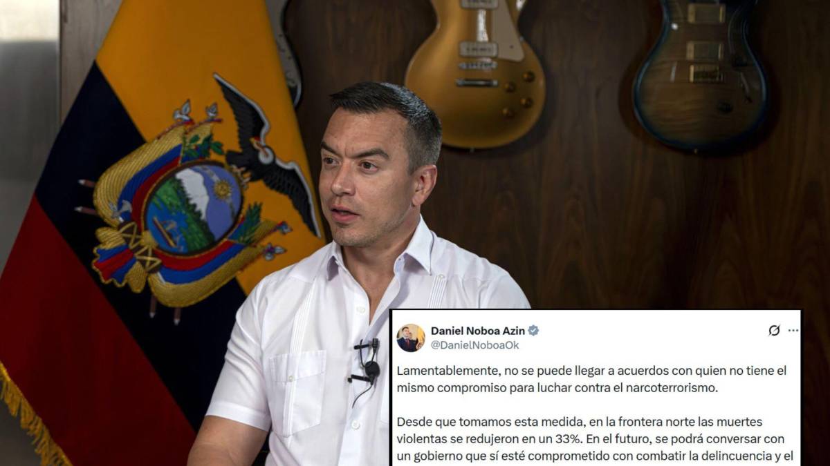 “Lamentablemente, no se puede llegar a acuerdos con quien no tiene el mismo compromiso para luchar contra el narcoterrorismo”, escribió el presidente Noboa, agregando que desde que las autoridades ecuatorianas reforzaron la seguridad en la frontera, “las muertes violentas se redujeron en un 33 %”.