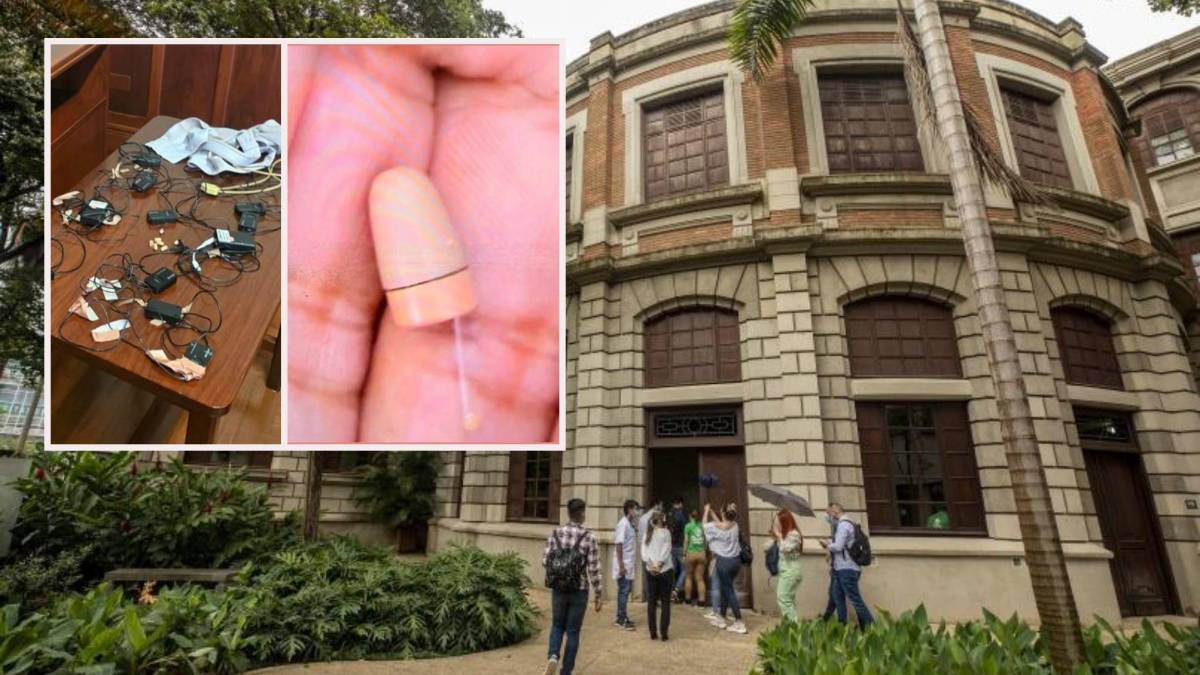 Adelante, los dispositivos hallados en el examen. Atrás, detalle de la Facultad de Medicina de la Universidad de Antioquia. Foto: Andrés Camilo Suárez Echeverry y Cortesía.