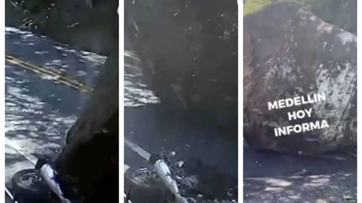 Momento en el que el peñón se desprende y aplasta la moto de un conductor. FOTO: imagen redes sociales Medellín Hoy Informa