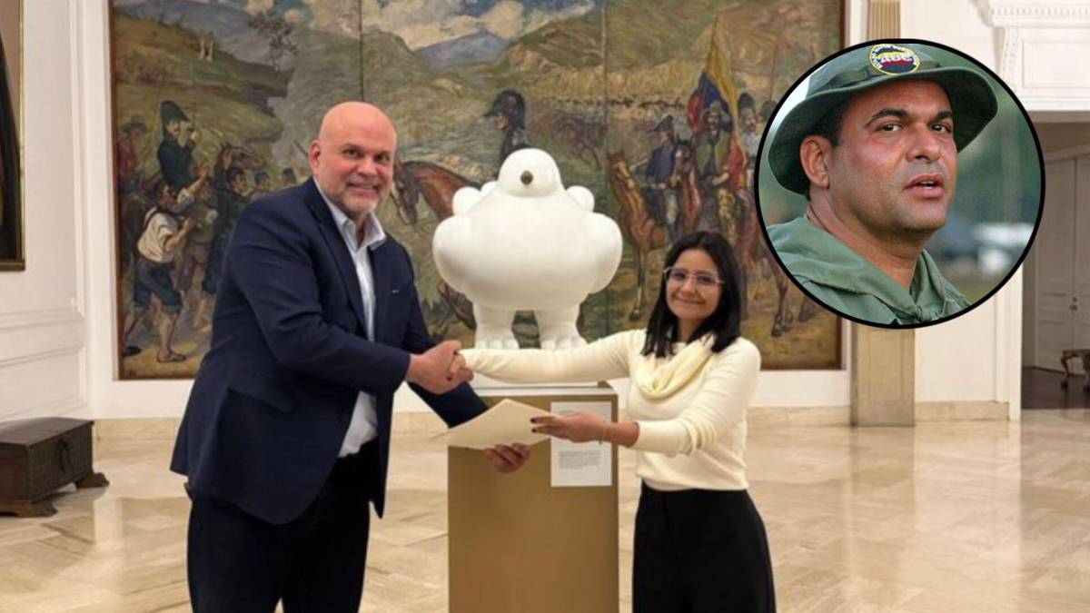 • Salvatore Mancuso posó junto a la directora del Dapre, Angie Rodríguez en el salón donde está ubicada la emblemática paloma de la paz de Fernando Botero. Fotos: @MancusoSalvat y Colprensa