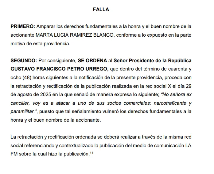 En la resolución, el despacho judicial ordena al presidente “proceder con la retractación y rectificación de la publicación realizada en la red social X el día 29 de agosto de 2025, (...) puesto que tal señalamiento vulneró los derechos fundamentales a la honra y el buen nombre de la accionante”. La decisión responde a una tutela presentada por Ramírez, quien alegó que el comentario de Petro la vinculó falsamente con actividades delictivas.