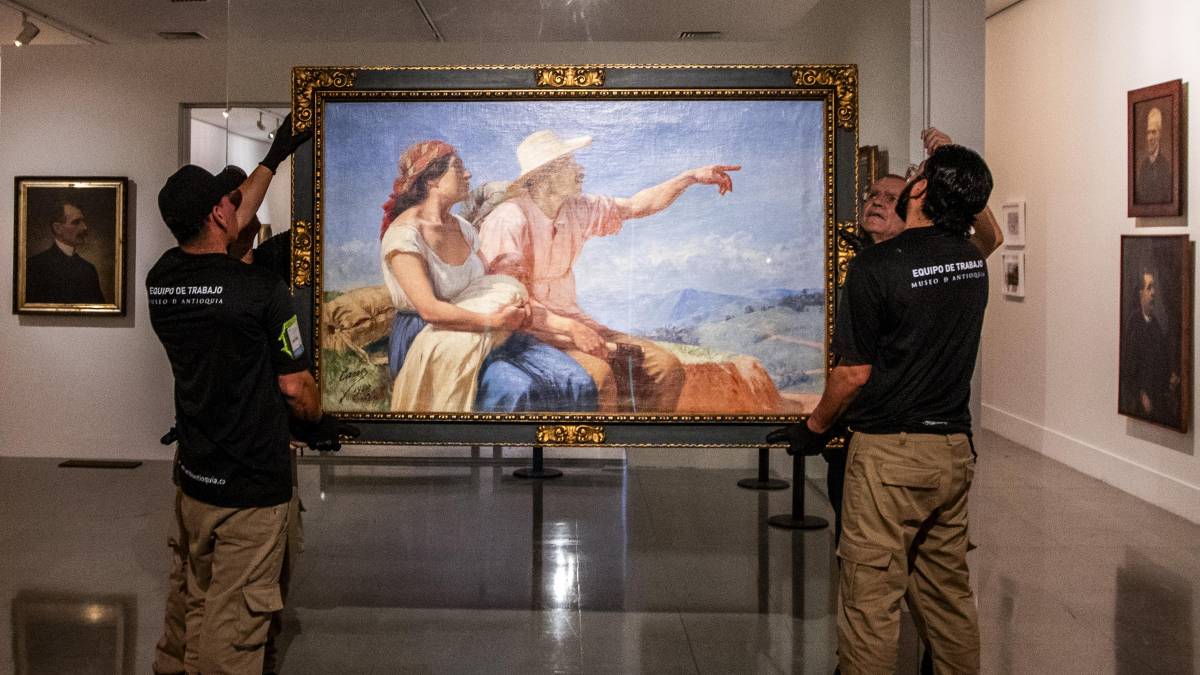 Cuando el visitante llega, encuentra de frente, sin más rodeos, a la espléndida, rozagante y blanca pareja de fundadores que nos hemos acostumbrado a ver en cada pueblo de Antioquia, en cada esquina de la ciudad, con su aureola de orden, bendición y nostalgia. Ellos ocupan el lugar central de la sala, al igual que el de los imaginarios, desde que fue pintada en 1913. Pero al reposar sobre un cristal, sus personajes ya no están aislados ni protegidos por la mano sacralizadora del museo. A contrario, emergen desarmados y vulnerables, en medio del tumultuoso tráfico de símbolos y de fieras disputas por el significado que es siempre un relato.