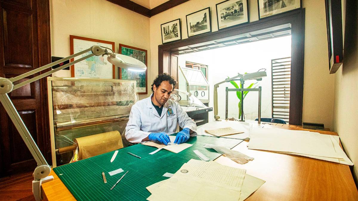 Acá en el archivo, como restauradores, tenemos un proceso para enfrentar los bienes. Lo primero era identificar en qué materiales estaba hecho, que era una tela, y el tipo de tintas que tenía. Hacemos un diagnóstico, una historia clínica con los datos del plano y luego pensamos cómo vamos a hacer la restauración. Hay un proceso de limpieza, de retirado de materiales que no corresponden con el original y empezamos a buscar la homogeneidad del plano, devolviéndole las características de legibilidad.