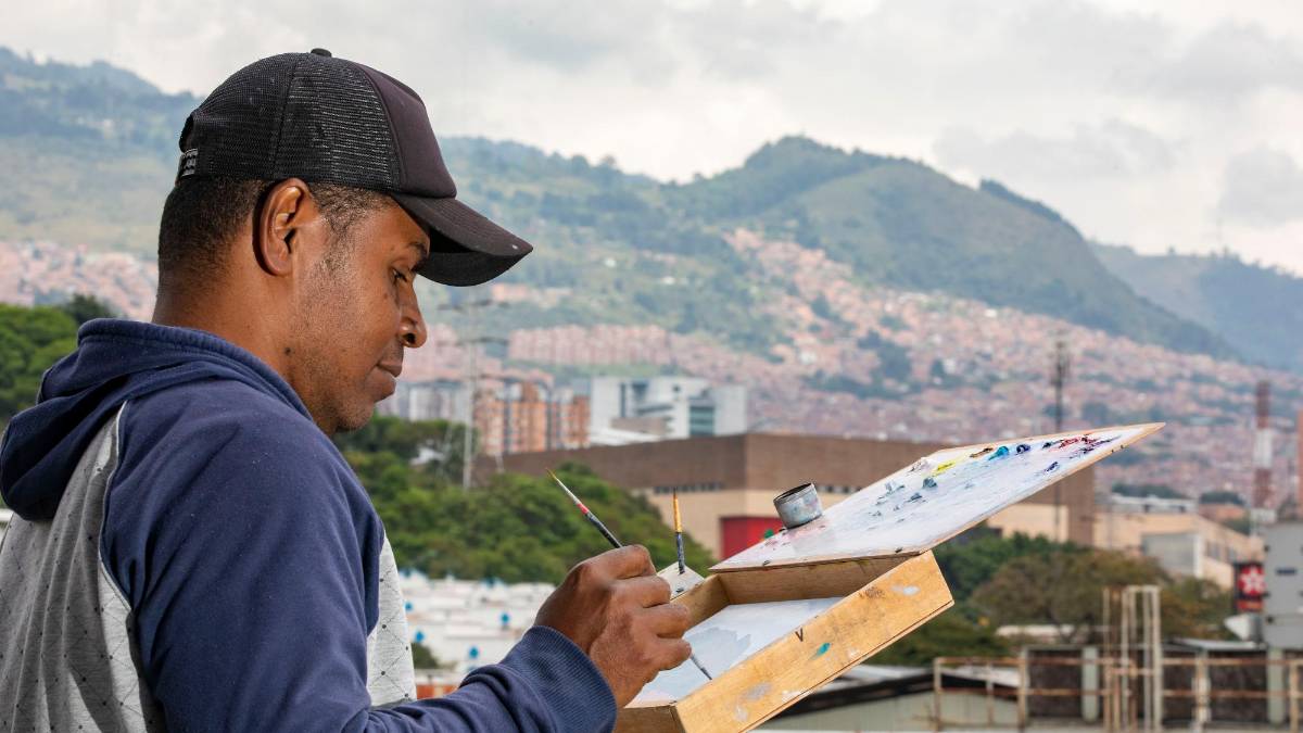 En la pared principal de su taller en el centro de Medellín hay colgados 104 de esos cuadros. Cada uno corresponde a la misma imagen del cerro en un día distinto de los últimos meses. Para pintar al natural en un entorno plenamente urbano como el puente de Punto Cero, al estilo de los paisajistas del siglo XIX, se inventó una caja de madera del tamaño de un libro, donde fija el pequeño bastidor en blanco. La tapa de la caja le sirve de paleta para mezclar los colores. La caja cerrada, convertida en caballete portátil, le cabe en el maletín con el que sale cada día al encuentro de los colores del cerro.