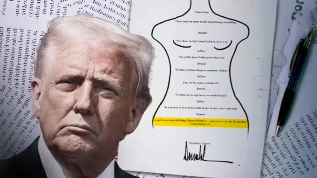 En ella aparece un esbozo de un busto femenino, con un intercambio imaginario entre Jeffrey Epstein y Donald Trump, entonces dos conocidos rostros de la jet set neoyorquina. Una firma que parece ser la del futuro presidente estadounidense figura al pie del texto, en el lugar del pubis de la mujer dibujada.