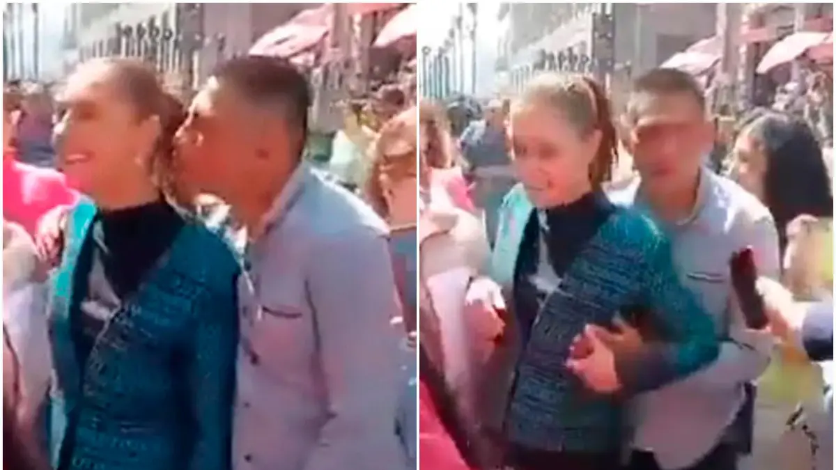 Sin ningún agente de seguridad a la vista que lo detuviera, el sujeto se acercó a Sheinbaum, le pasó un brazo encima del hombro mientras con el otro le tocó la cadera y el pecho, además de intentar besarla en el cuello.